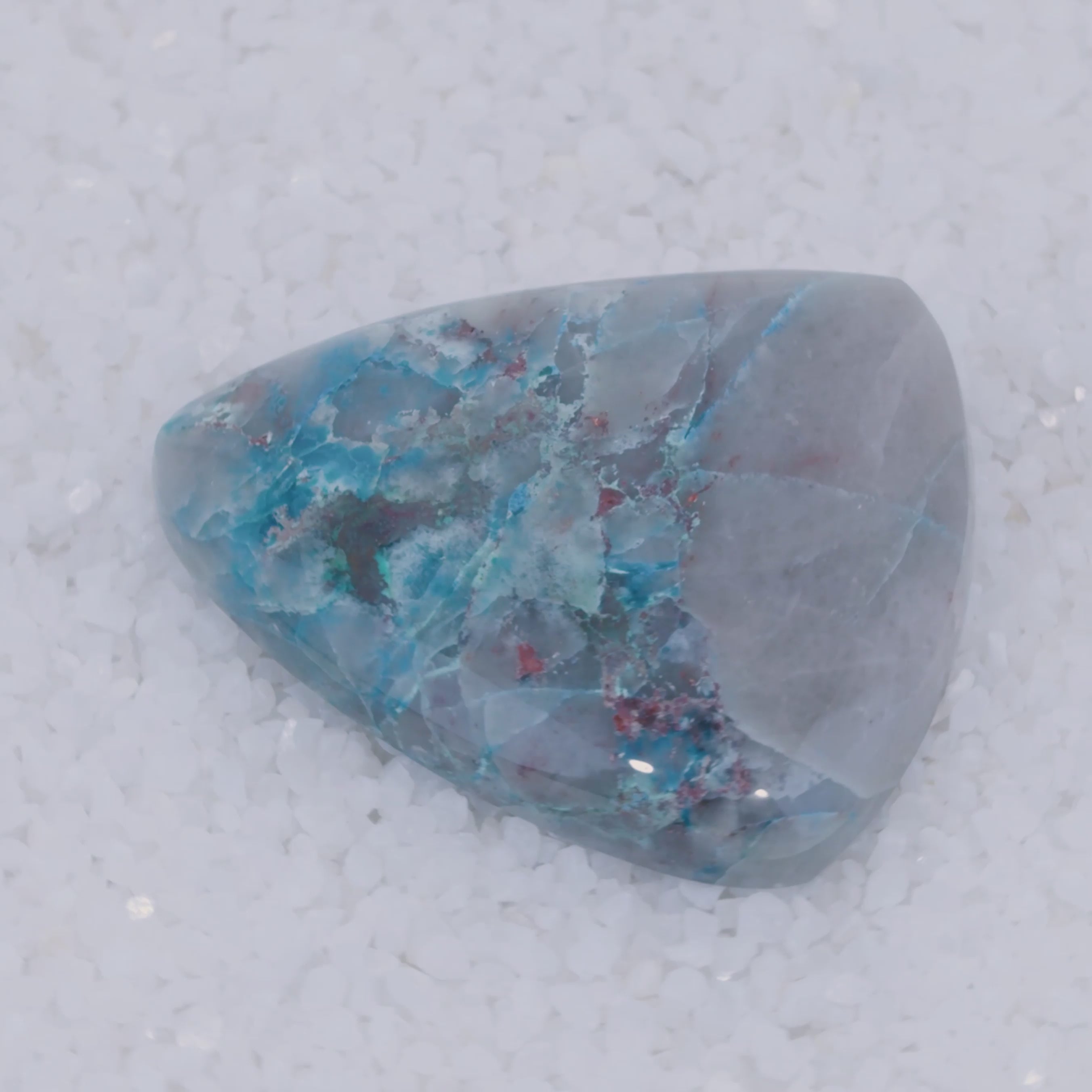 Sourced from a small singular deposit in Southern Arizona, Canyonite Sky is a copper mineral gemstone of unmatched rarity. This cabochon reveals sky-blue Papagoite, teal Ajoite, indigo Shattuckite—three of the world's rarest copper minerals—embedded with crimson Cuprite in a translucent druzy chalcedony matrix.