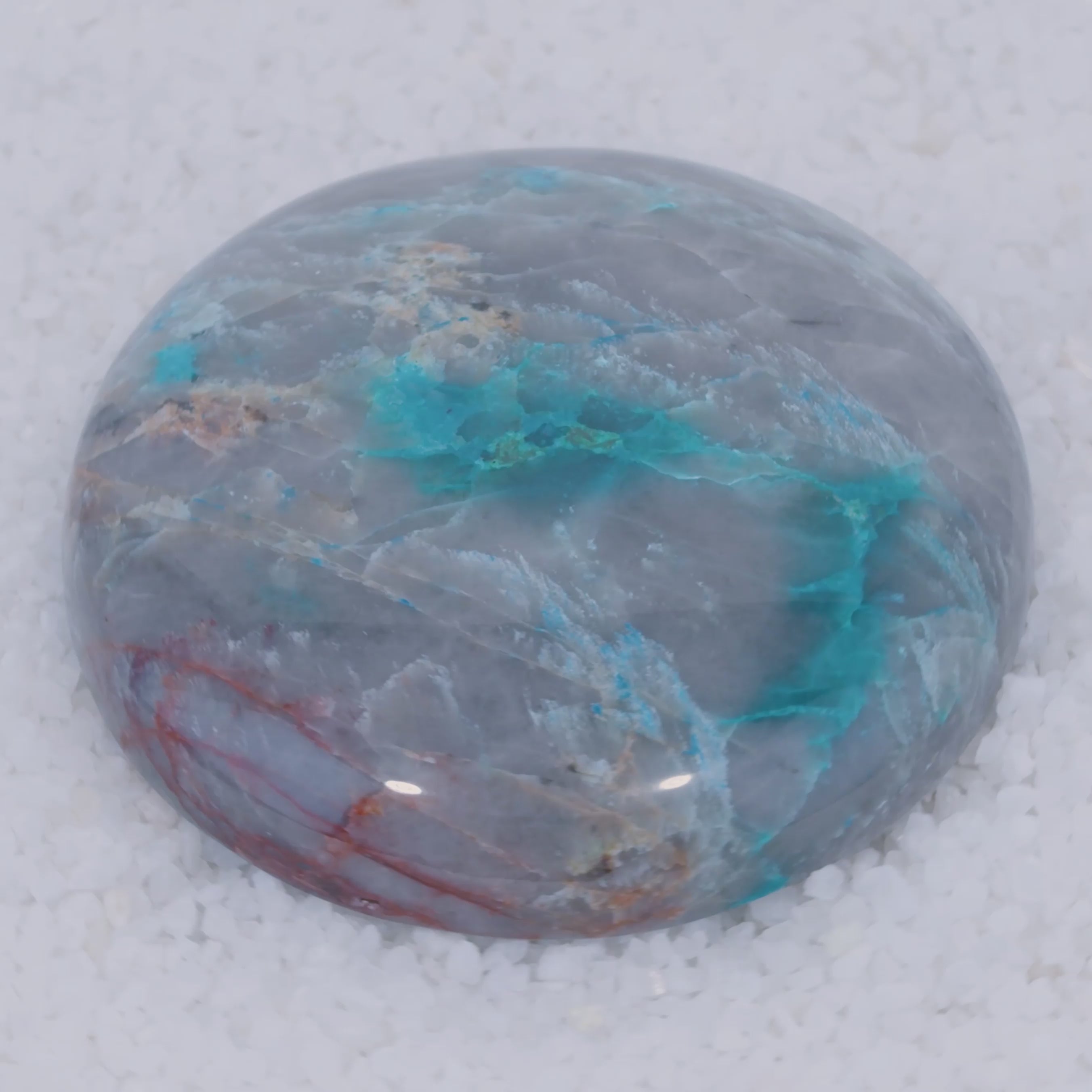A once-in-a-lifetime rarity from Southern Arizona, this cabochon showcases vivid emerald-green Brochantite crystals, sky-blue Chrysocolla and crimson Cuprite suspended in translucent chalcedony. While Brochantite is sometimes found on quartz or other matrix, it is exceptionally rare included in matrix, especially chalcedony, making this gemstone a one of a kind discovery.