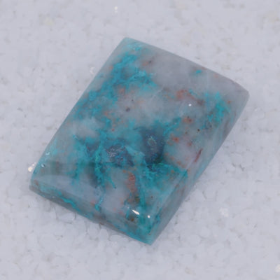A once-in-a-lifetime rarity from Southern Arizona, this cabochon showcases vivid emerald-green Brochantite crystals, sky-blue Chrysocolla and crimson Cuprite suspended in translucent chalcedony. While Brochantite is sometimes found on quartz or other matrix, it is exceptionally rare included in matrix, especially chalcedony, making this gemstone a one of a kind discovery.