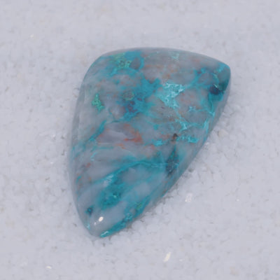 A once-in-a-lifetime rarity from Southern Arizona, this cabochon showcases vivid emerald-green Brochantite crystals, sky-blue Chrysocolla and crimson Cuprite suspended in translucent chalcedony. While Brochantite is sometimes found on quartz or other matrix, it is exceptionally rare included in matrix, especially chalcedony, making this gemstone a one of a kind discovery.