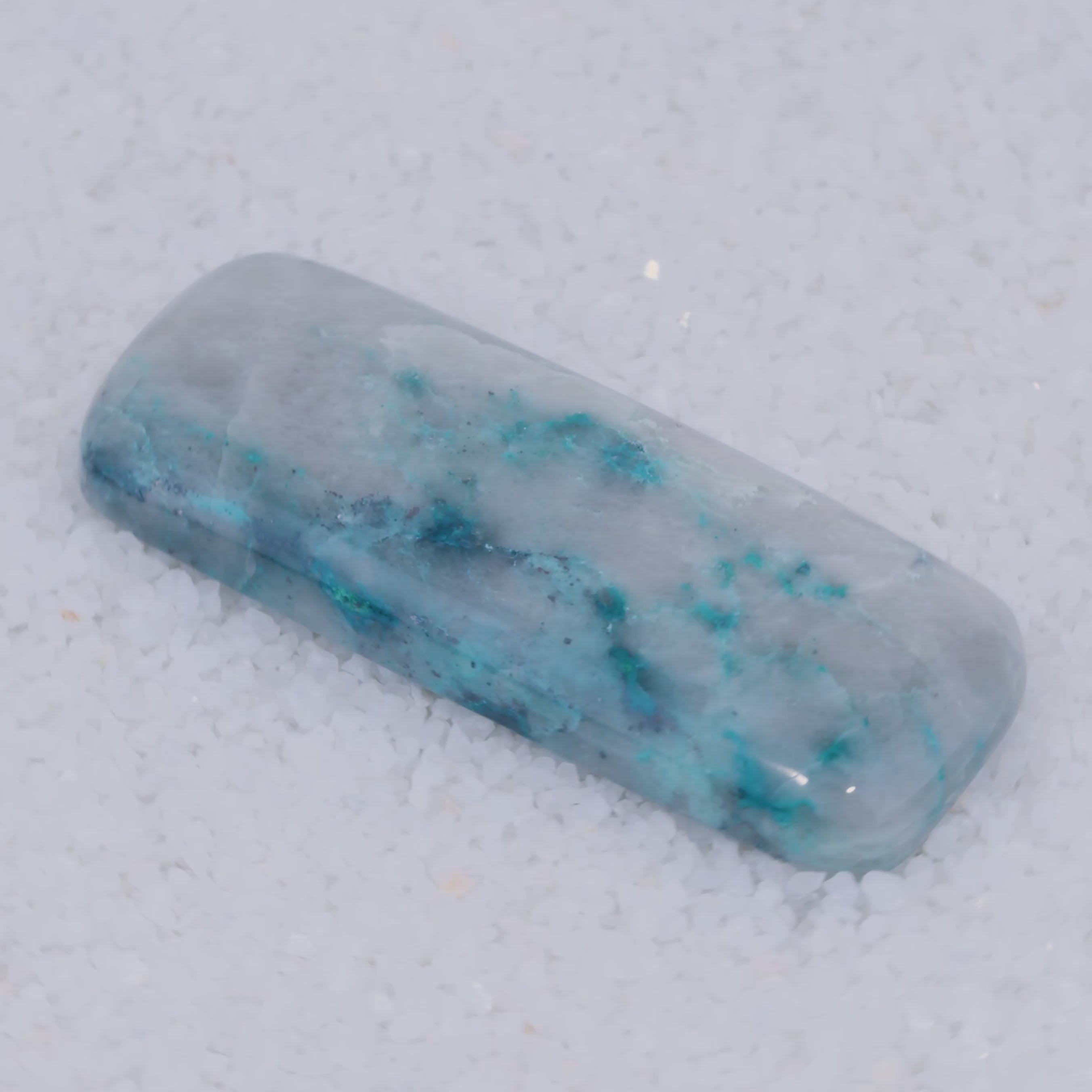 A once-in-a-lifetime rarity from Southern Arizona, this cabochon showcases a small inclusion of vivid emerald-green Brochantite crystals, and sky-blue Chrysocolla suspended in translucent chalcedony. While Brochantite is sometimes found on quartz or other matrix, it is exceptionally rare included in matrix, especially chalcedony, making this gemstone a one of a kind discovery.