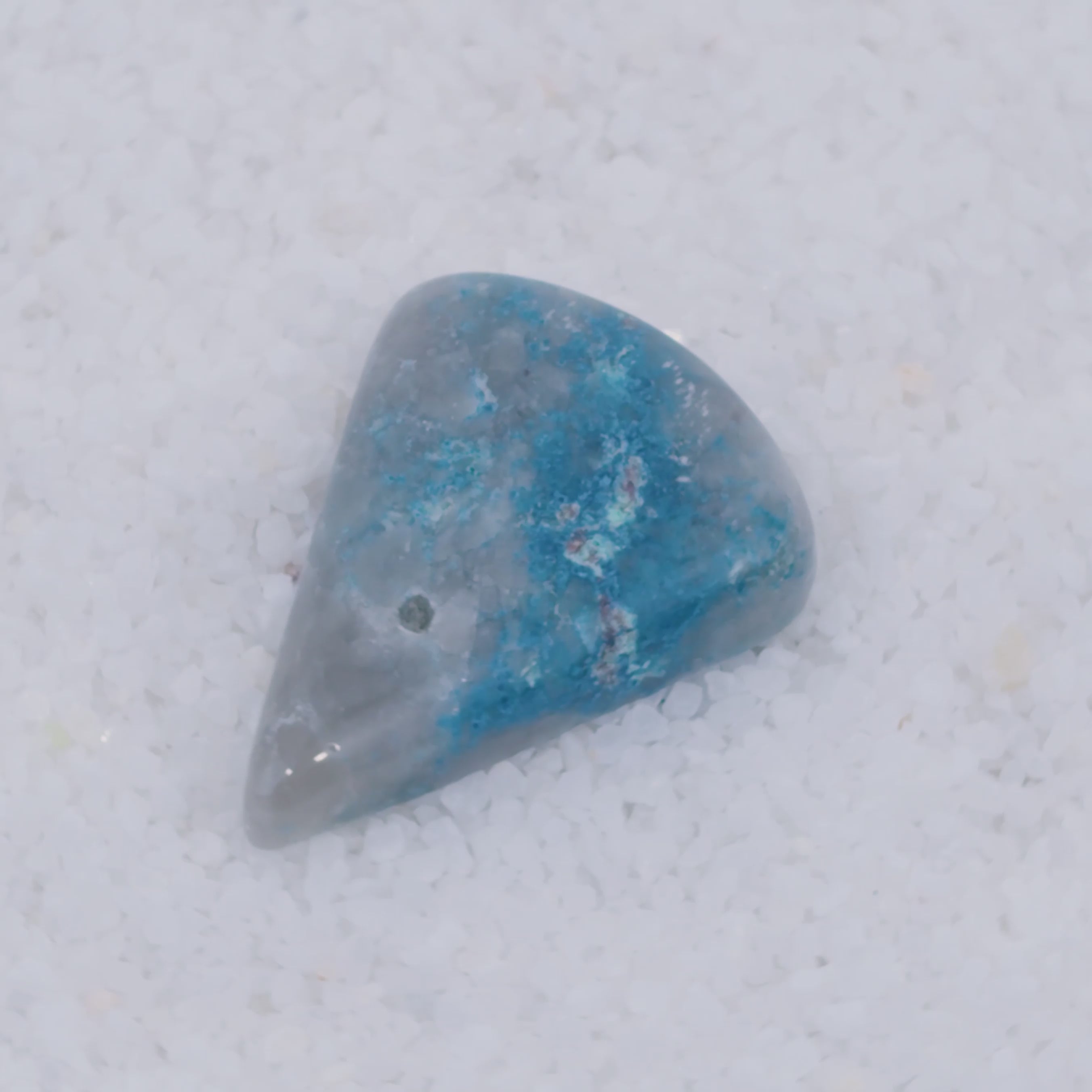 Sourced from a small singular deposit in Southern Arizona, Canyonite Sky is a copper mineral gemstone of unmatched rarity. This cabochon reveals sky-blue Papagoite, teal Ajoite, indigo Shattuckite—three of the world's rarest copper minerals—embedded with crimson Cuprite in a translucent druzy chalcedony matrix.