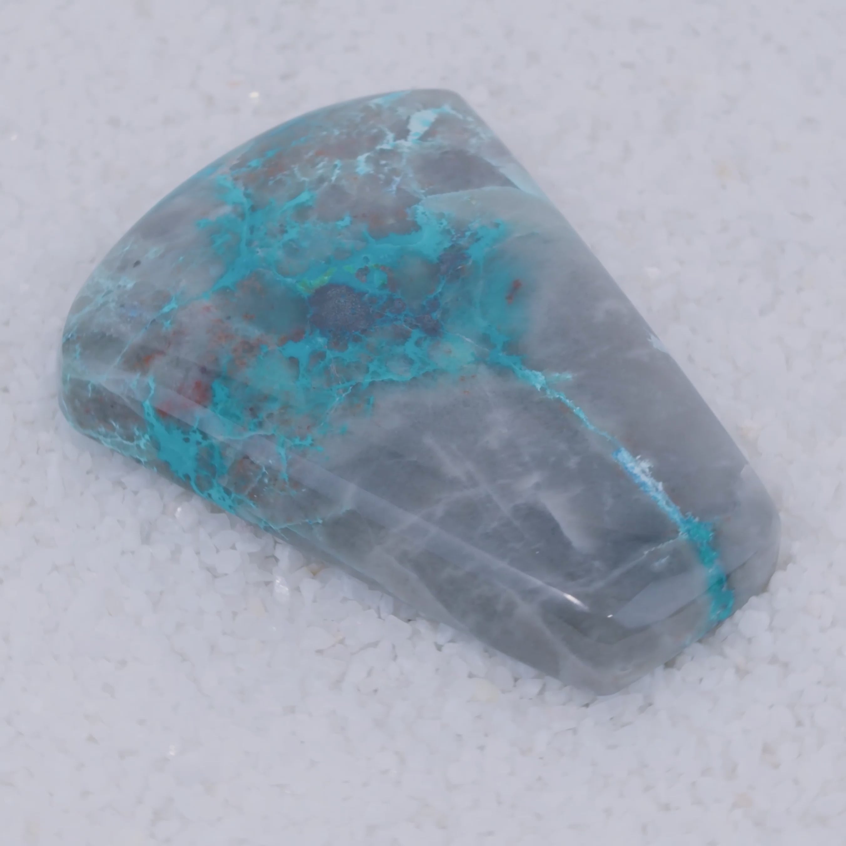 A once-in-a-lifetime rarity from Southern Arizona, this cabochon showcases vivid emerald-green Brochantite crystals, sky-blue Chrysocolla and crimson Cuprite suspended in translucent chalcedony. While Brochantite is sometimes found on quartz or other matrix, it is exceptionally rare included in matrix, especially chalcedony, making this gemstone a one of a kind discovery.