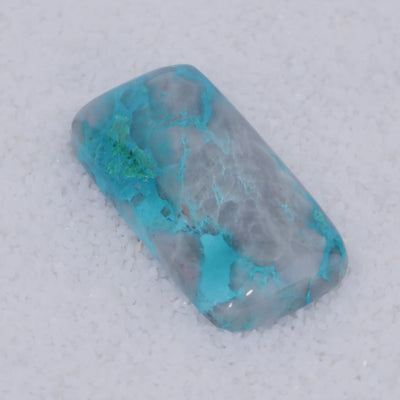 A once-in-a-lifetime rarity from Southern Arizona, this cabochon showcases vivid emerald-green Brochantite crystals, sky-blue Chrysocolla and crimson Cuprite suspended in translucent chalcedony. While Brochantite is sometimes found on quartz or other matrix, it is exceptionally rare included in matrix, especially chalcedony, making this gemstone a one of a kind discovery.