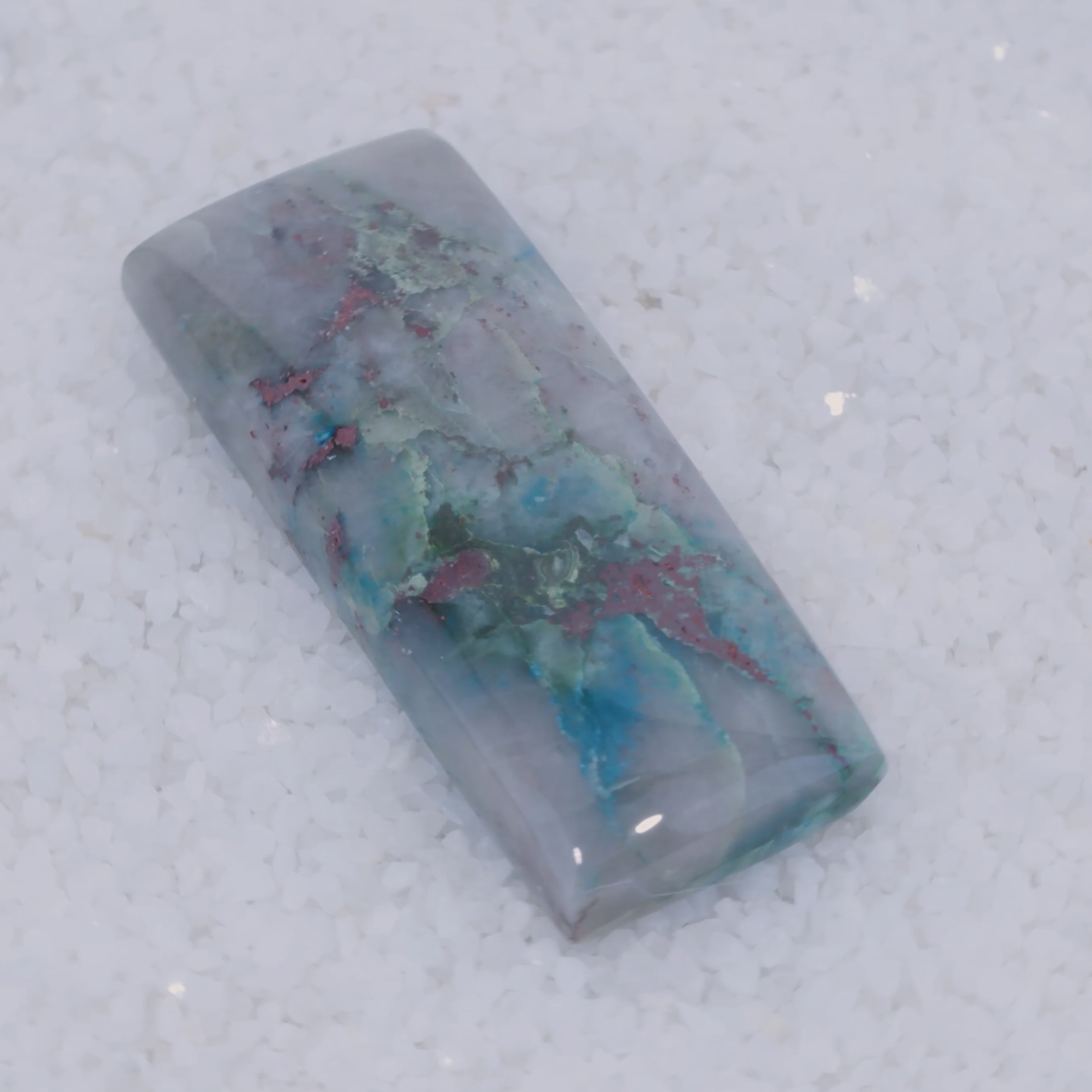 Sourced from a small singular deposit in Southern Arizona, Canyonite Sky is a copper mineral gemstone of unmatched rarity. This gemstone reveals sky-blue Papagoite, teal Ajoite, indigo Shattuckite—three of the world's rarest copper minerals—embedded with crimson Cuprite in a translucent druzy chalcedony matrix.