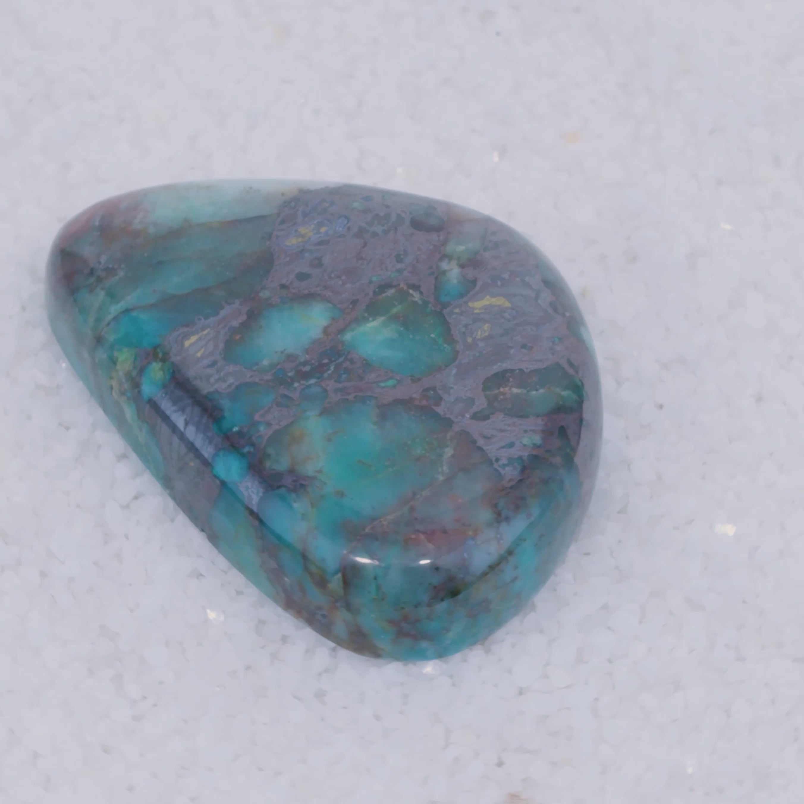 Sourced from a small singular deposit in Southern Arizona, Canyonite Sky is a copper mineral gemstone of unmatched rarity. This cabochon reveals sky-blue Chrysocolla, Hematite, Copper, and Chalcopyrite, in a chalcedony matrix.